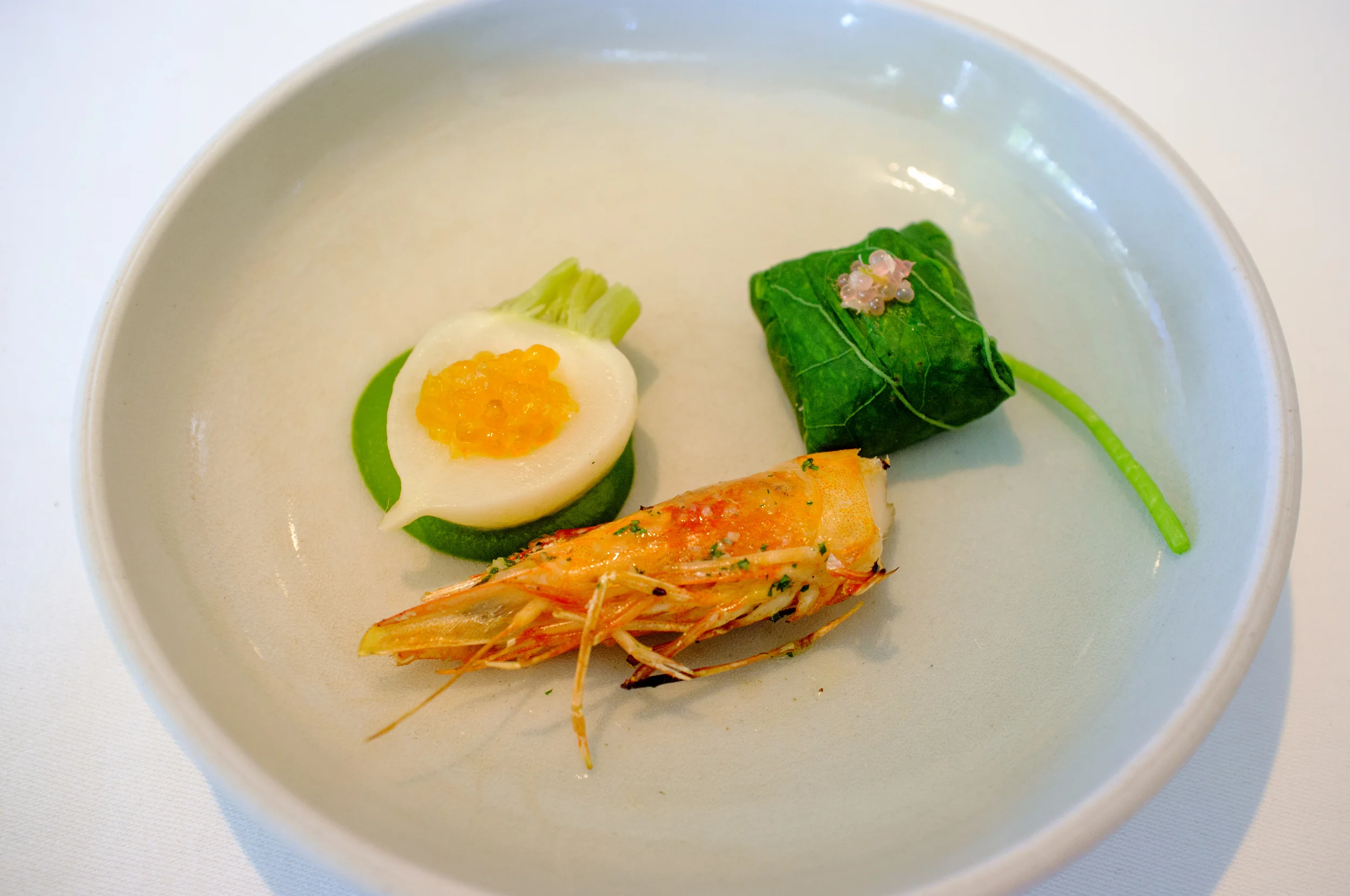 Turnip and brook trout; prawn, nasturtium and finger lime