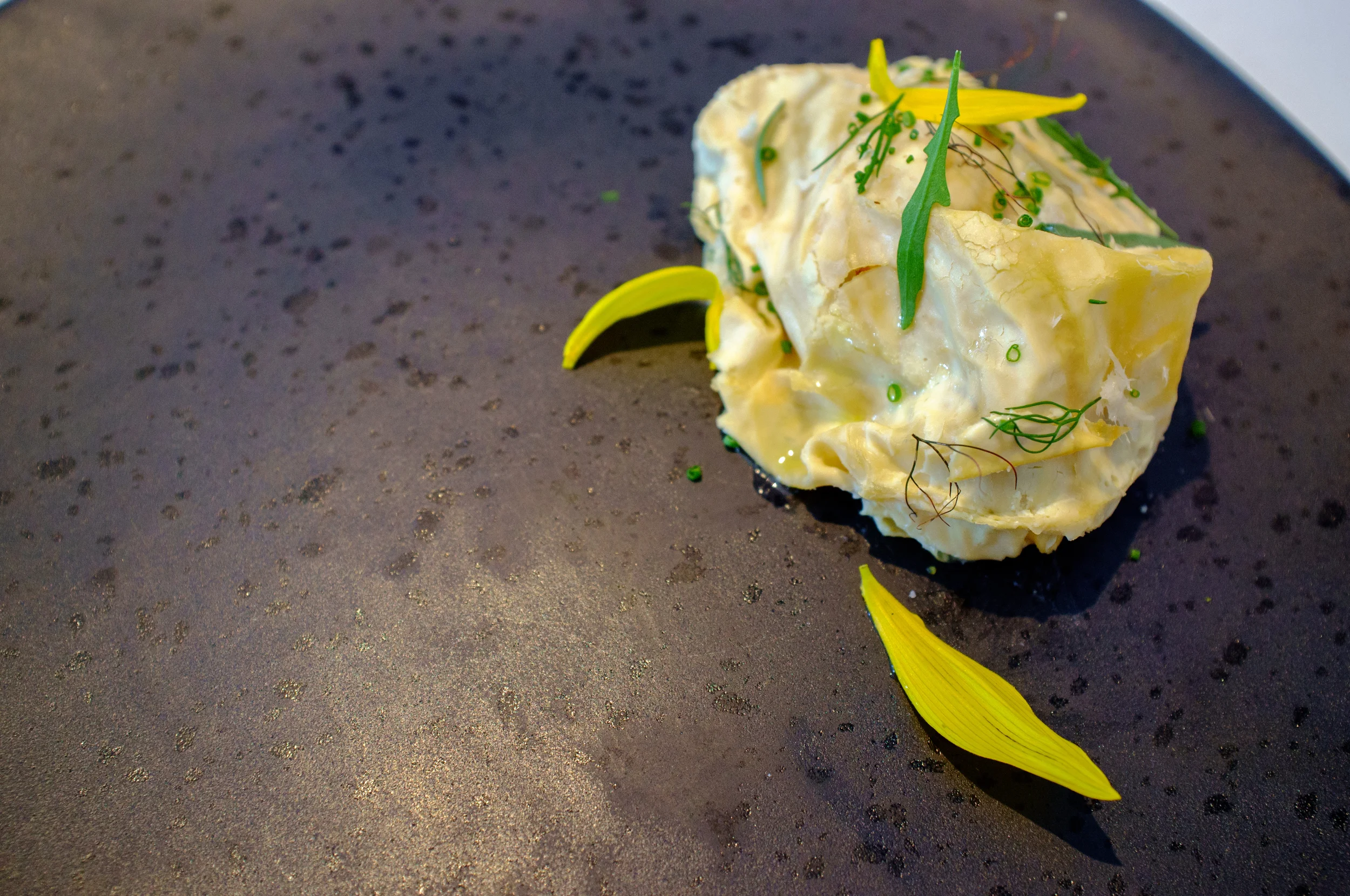 The crayfish and burnt potatoes, with flathead roe and mustard, came hidden under a silky layer of milk skin. Earthy and milky, with mild flavors, I was hoping the dish was served tepid instead of at room temperature.