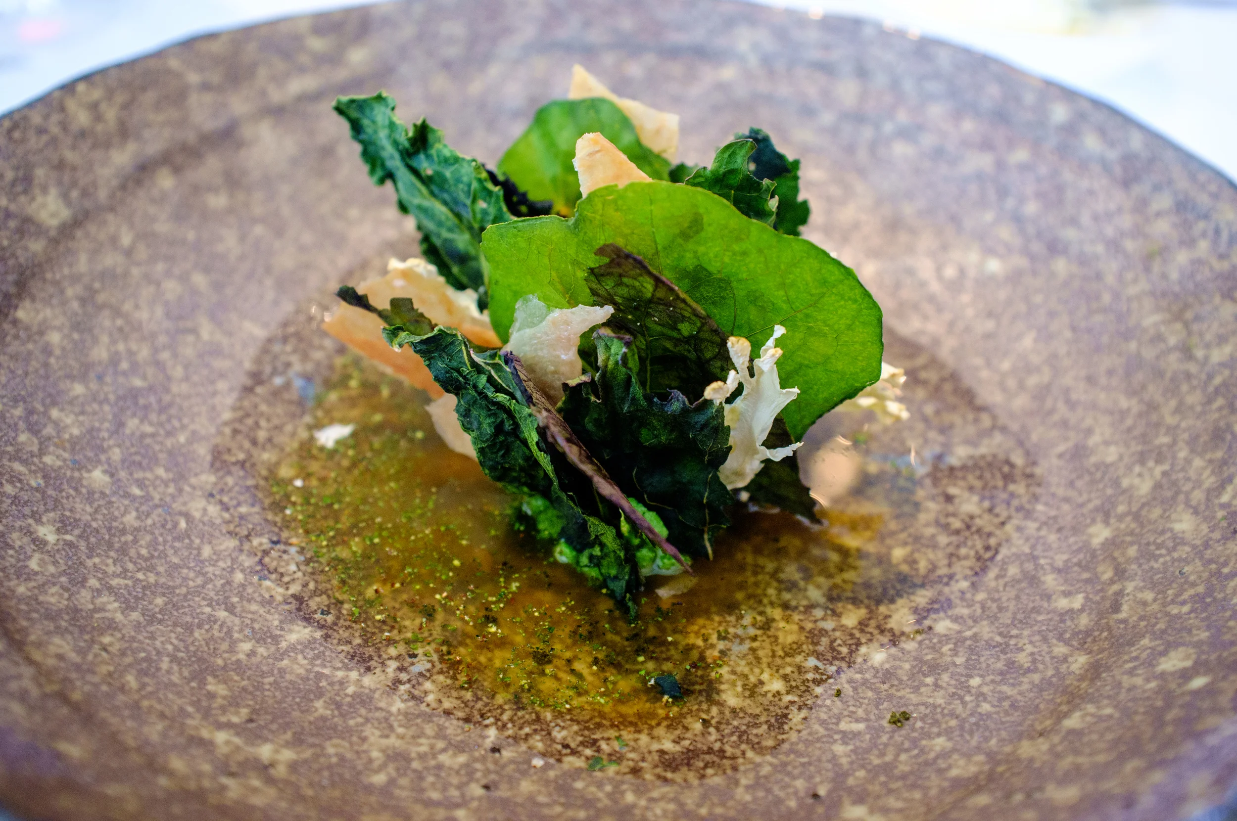 Like every other dish, the “warm ricotta and nettle with roasted chicken and brassicas” doesn’t give you the slightest hint as to what image you might conjure up with that description. The crisped chicken skins, ricotta and nettles, in a light broth, form a perfectly harmonious mélange growing out of the accentuated flavors of each constituent.