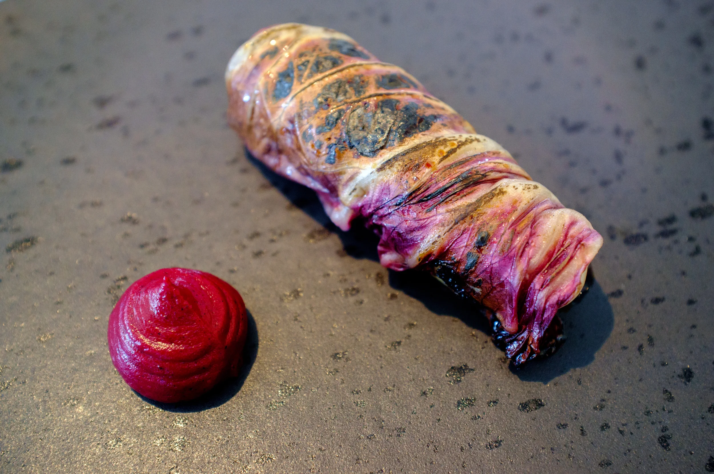 You are served the “barbecued wallaby, not barbecued” with explicit instructions to contemplate its curiosity. Having partaken in the eating, perhaps not so much on the contemplation, the secret is then revealed to you: it’s finely chopped raw wallaby encased in charred radicchio, alongside a charred beetroot-based sauce. Delicious.