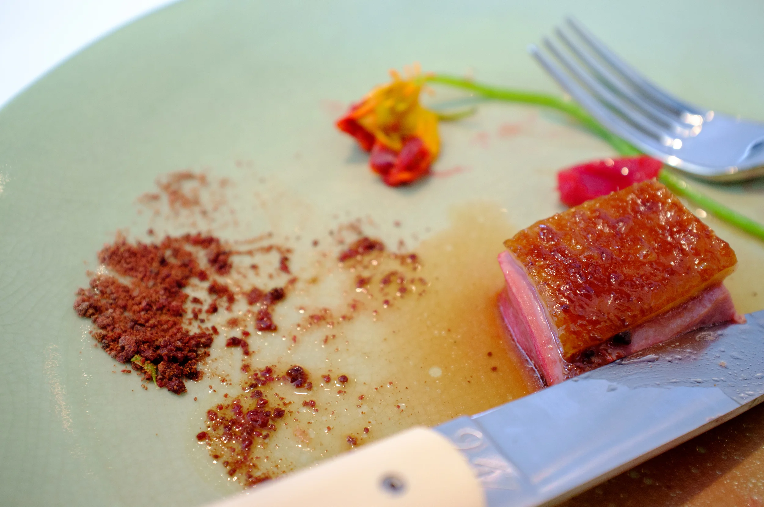 Aged Pekin duck wood roasted on the bone, quandong, dried liver
