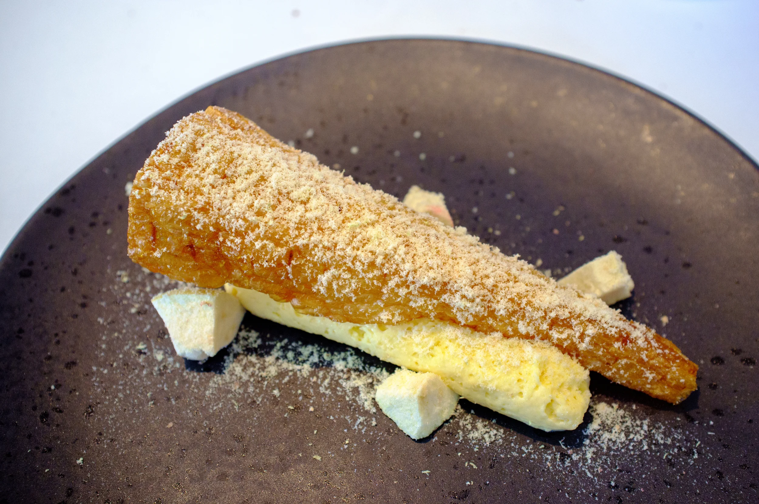 How do you make parsnip taste more like parsnip? Leave it to Dan’s dessert of crisp parsnip skin over an apple and parsnip mousse. Instead of being merely sweet, this was intensely flavorful, with the freeze-dried and grated freeze-dried apples providing textural variety.