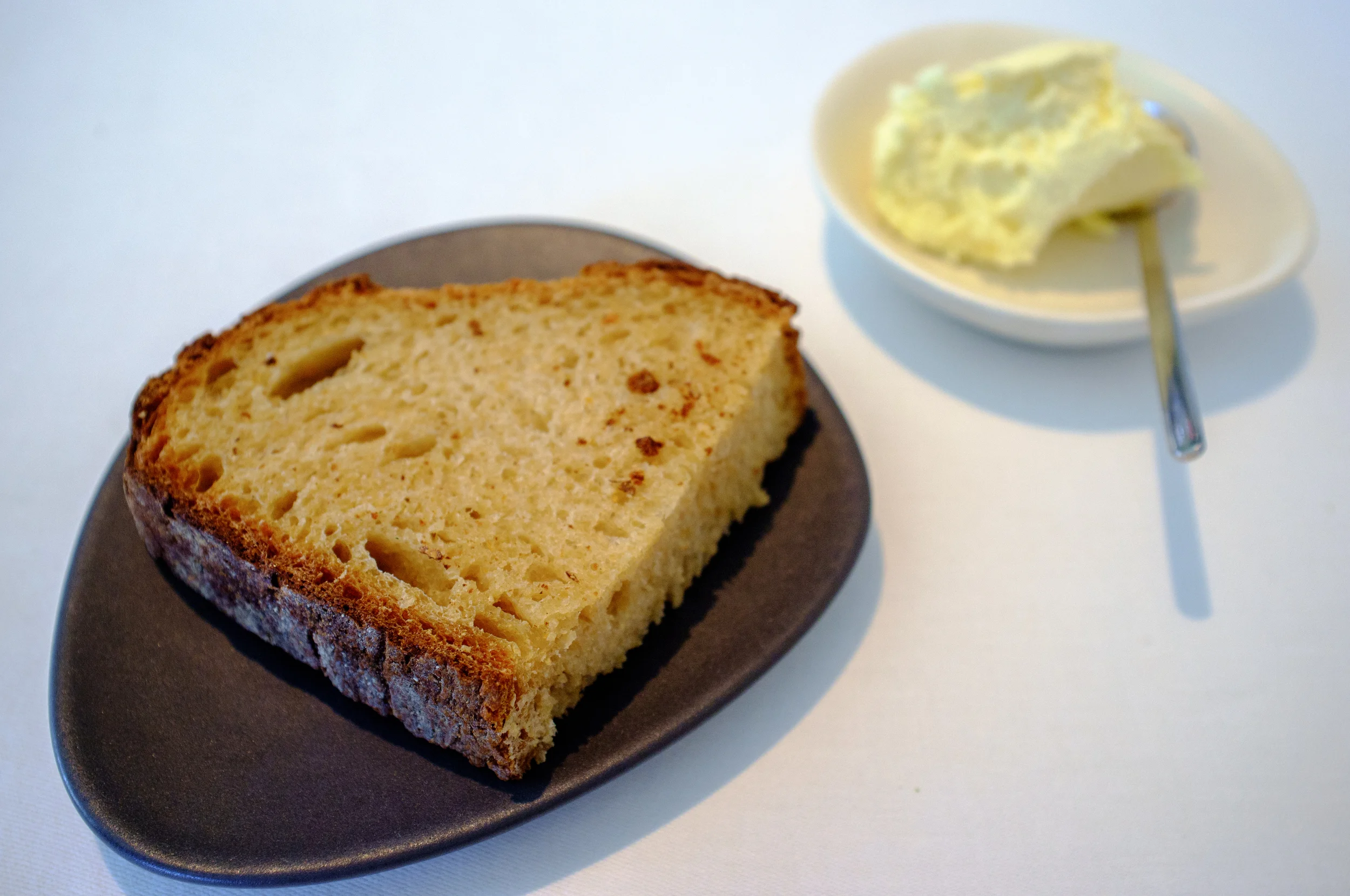 Unlike many places, Bread is not an afterthought here. It’s what’s fired into the wood-burning brick oven first thing every morning, and it’s one of the most remarkable things to eat here. It seems like a wholly appropriate start to the kitchen day. The whole-wheat sourdough, made using a combination of stone-ground biodynamic whole-wheat and white flour, both sourced from Wholegrain Milling in Gunnedah, has a dark hard crust, malty and lightly caramelly, a soft dark interior, less chewy than you might expect, but in a good way, with a slight tang. Combined with the homemade lightly churned butter from rich Jersey milk it’s hard to separate which is meant to be a vehicle for the other.